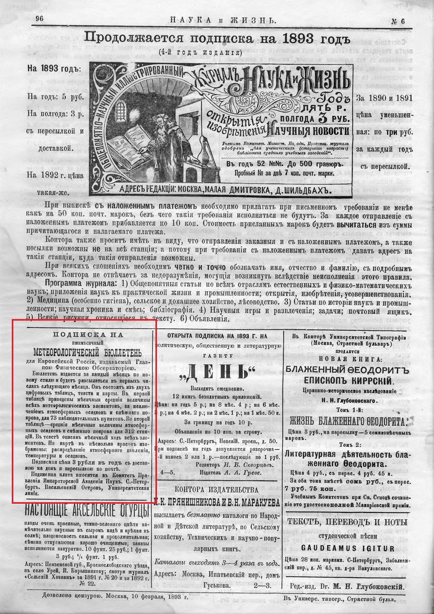 Вариант «Бюллетеня погоды» печатался в «Санкт-Петербургских ведомостях», на него можно было подписаться: стоимость подписки в конце XIX века для граждан России составляла 12 рублей, а для зарубежных 18 рублей.