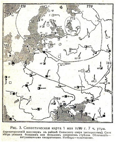 рта погоды в Европе за интервал времени между 9 и 10 часами утра. Карта была составлена по погодным данным, присланным в Париж телеграфом из ряда европейских городов, на ней были проведены линии равного давления – изобары. При наноске обнаружилось, что линии имеют замкнутую форму и очерчивают области высокого и низкого давления, и именно они формируют погоду.