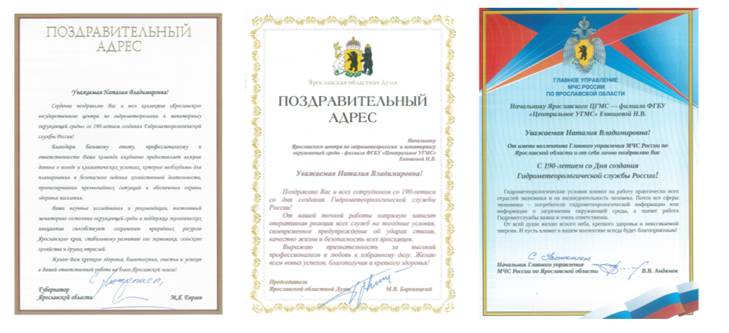 Сотрудники Ярославского ЦГМС были награждены грамотами и благодарностями Губернатора Ярославской области, Правительства Ярославской области, Министерства лесного хозяйства и природопользования Ярославской области, ГУ МЧС России по Ярославской области, мэрии города Ярославля.
