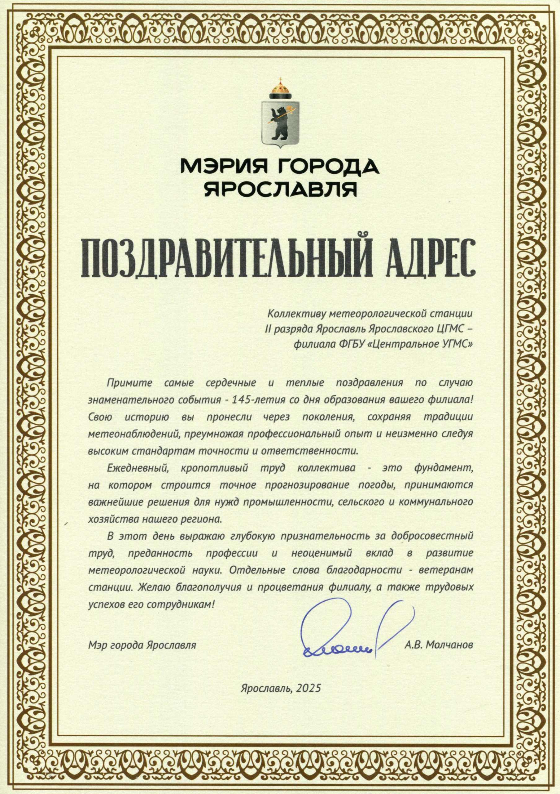 Мэр города Ярославля поздравил метеостанцию Ярославль с юбилеем