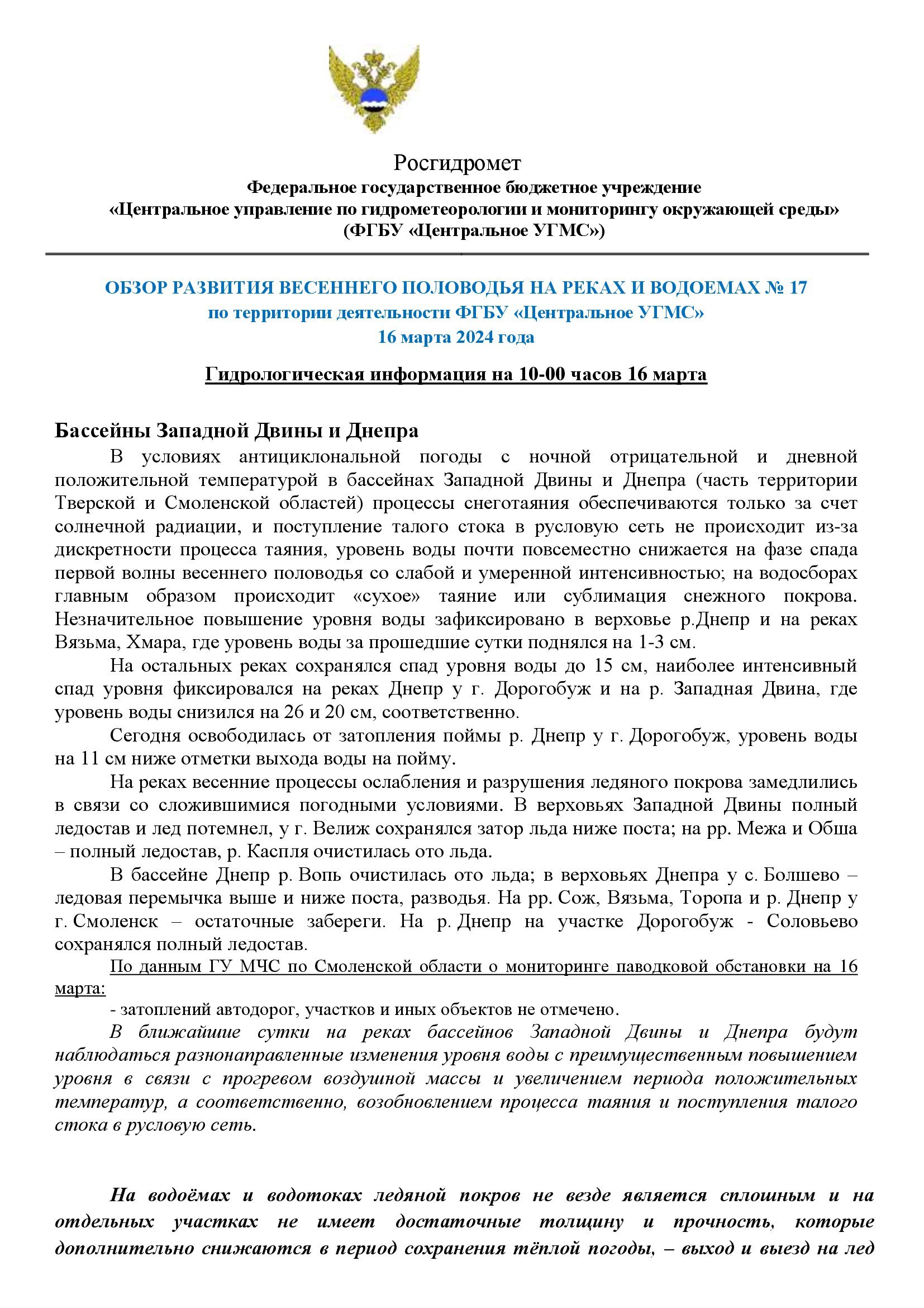 Обзор развития весеннего половодья на реках и водоемах № 17