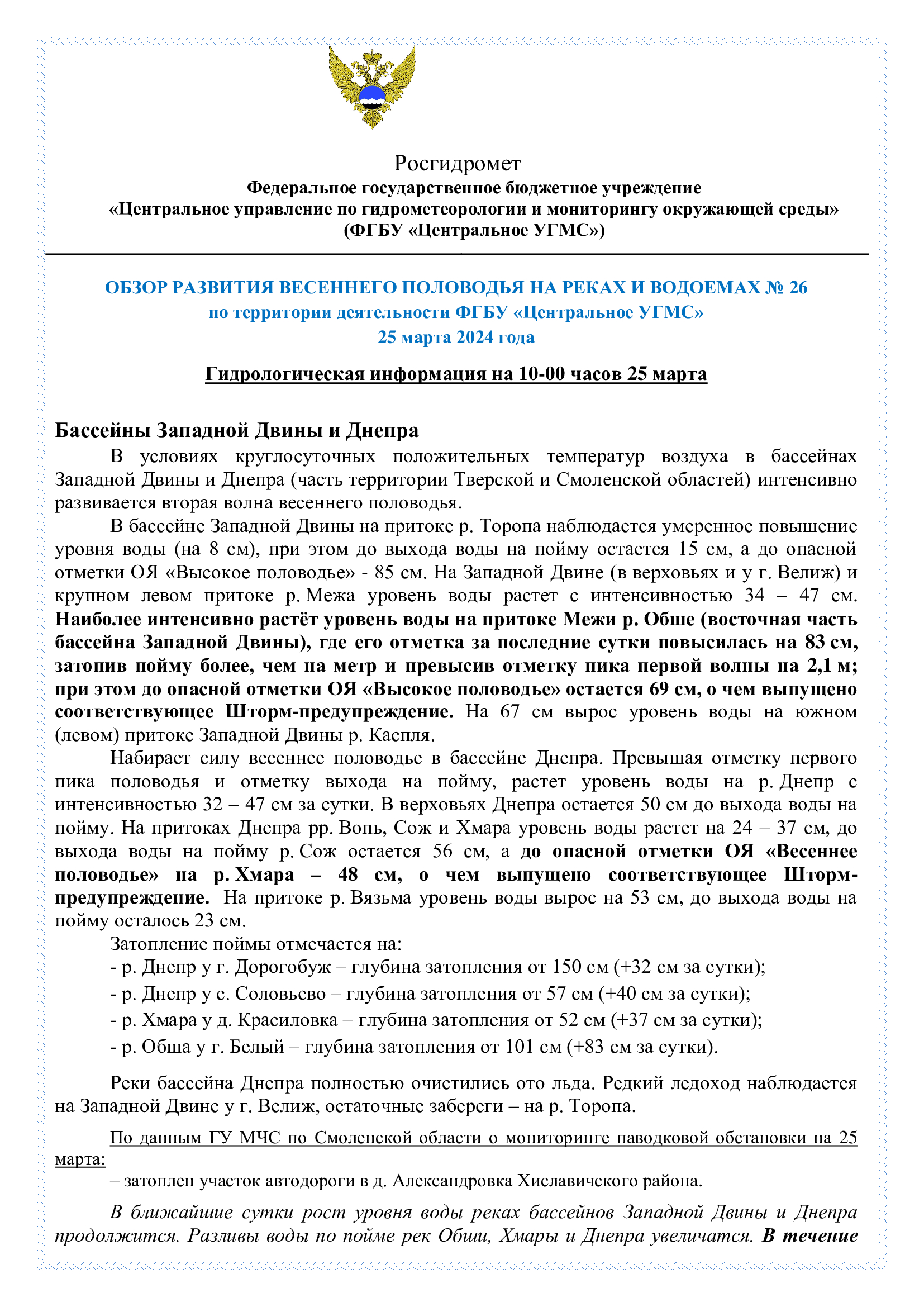 Обзор развития весеннего половодья на реках и водоемах №26