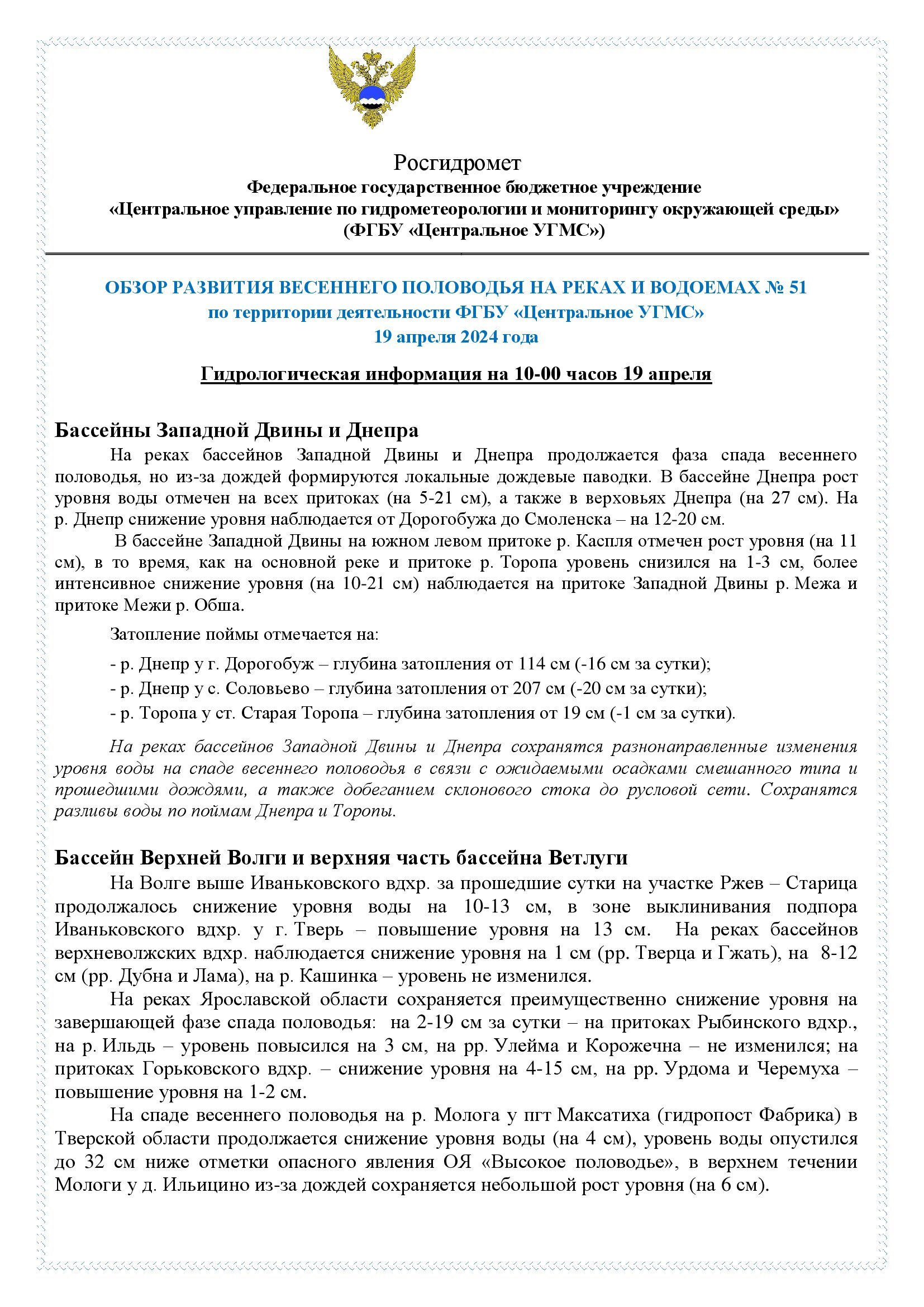 Обзор развития весеннего половодья на реках и водоемах №51